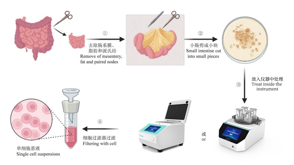 將消化管放入單細胞胞懸液制備儀上,選擇對應的腸道程序,程序結束后,儀器自動停止,然后加入終止液,離心,棄掉上清,用培養基重懸即可得到小腸固有層單細胞懸液。(如下圖)