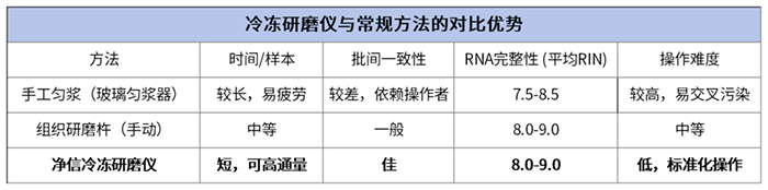 實(shí)驗(yàn)背景:RNA 提取成功與否,很大程度上取決于前處理階段能否借助冷凍研磨儀快速、充分地破碎組織,同時(shí)有效抑制 RNA 酶(RNase)活性,從源頭避免 RNA 降解。