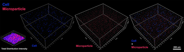 共聚焦圖像的3D建模顯示水凝膠結構內細胞(藍色)和TMP(紅色)的均勻3D分布,表明水凝膠結構中細胞和磁性顆粒的均勻分布。